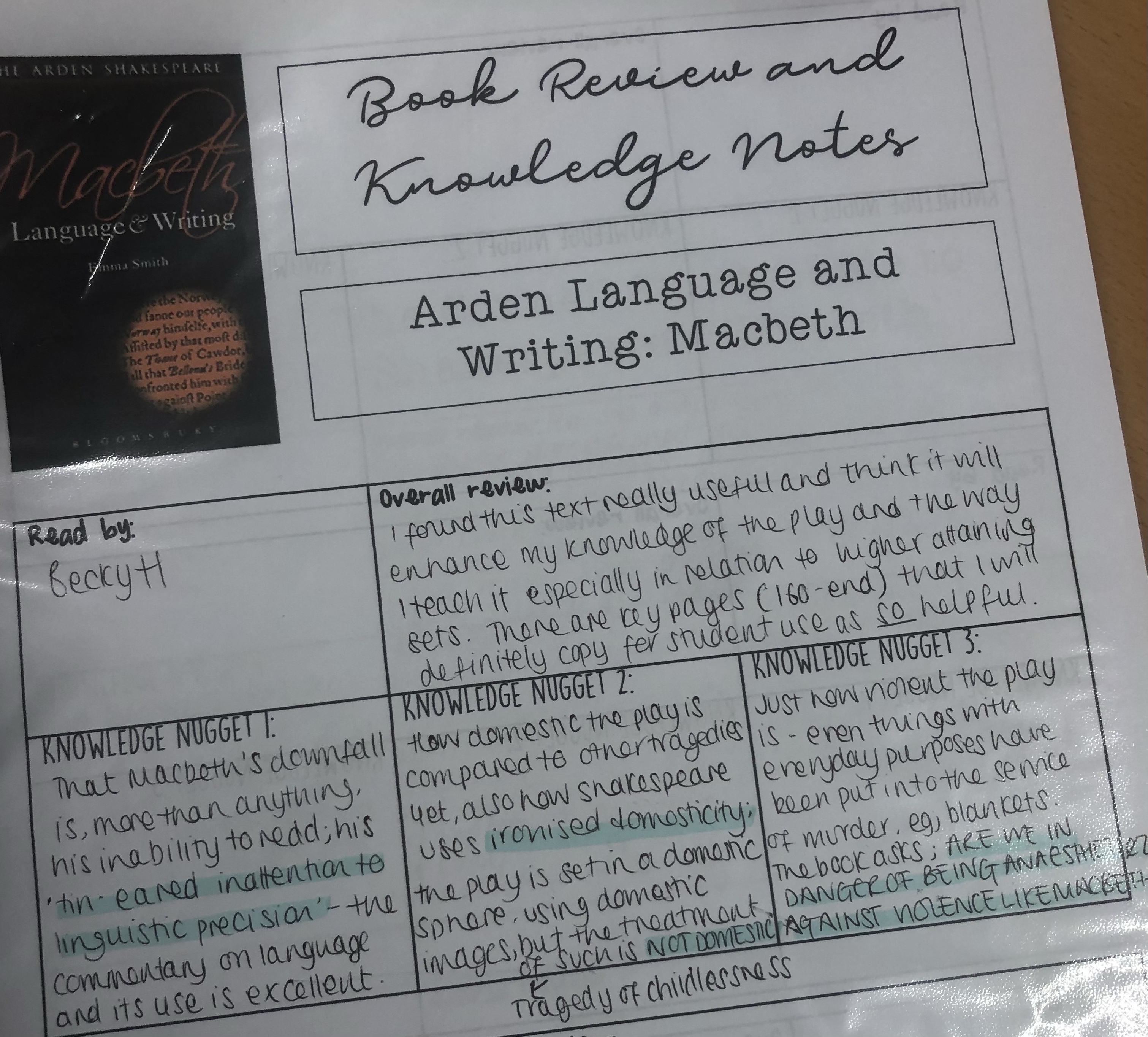 We then went around everyone and just shared the new knowledge. This took a lot of INSET time, but it was incredibly valuable, and so interesting. I wanted one person’s gain in knowledge to kind of snowball around the whole department, and then grow, as another person shared some ideas. The second purpose was that people would get interested in each other’s books – in particular the Arden Shakespeare Macbeth was very popular after the nuggets shared were particularly interesting. See below some examples of the sheets.