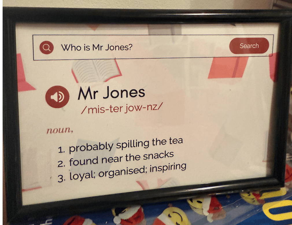 Aside from those general snack providing I will also buy edible gifts alongside a card if I feel people have gone above and beyond. I create end of Christmas/ year packs for my team and within them I try and include things I know the team like. It’s not always super expensive gifts – I also try and be thoughtful – like creating frames and nice print outs. When I left my last school I was going to buy online gifts but then created the following for each member of the team – with a focus on what they each liked or had spoken about in the 6 years I had worked there first as 2ic then as HOD. In my current school I made little frames defining each person as we were mostly a new team with relatively empty working spaces, and I wanted everyone to have something that characterised them. These things take time, and rely on points 4 and 5, but they make people feel seen more than a large bar of chocolate or a bottle of wine.