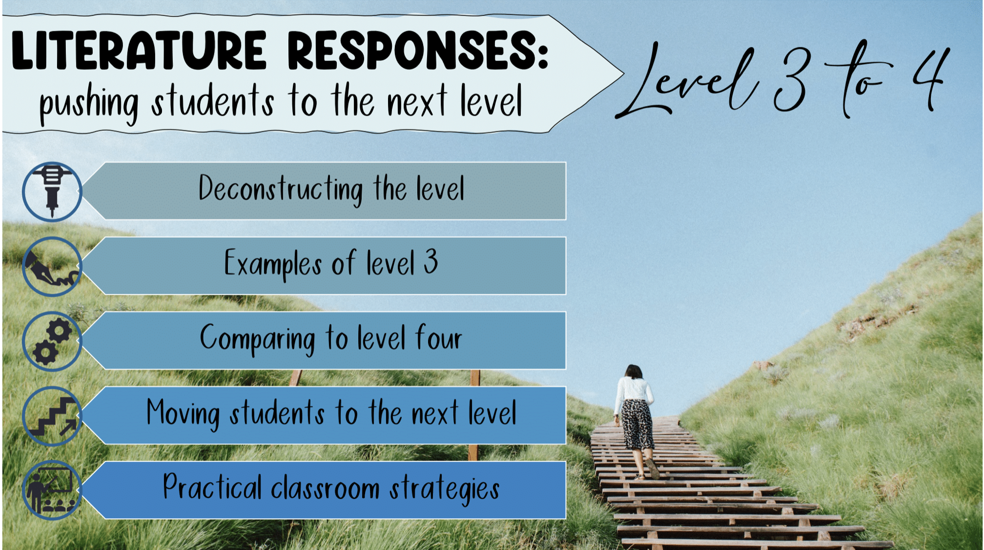 The session begins by examining and understanding level 2. We then look at examples from a range of texts – Macbeth, AIC, ACC, and the power and conflict cluster. We then deconstruct the expectations and features of level 3, and compare examples of each of the text responses at level 2 to the level 3 examples. We then look at the findings from these comparisons and specific teaching strategies to move students up the level. This session includes a massive folder of 40 resources.