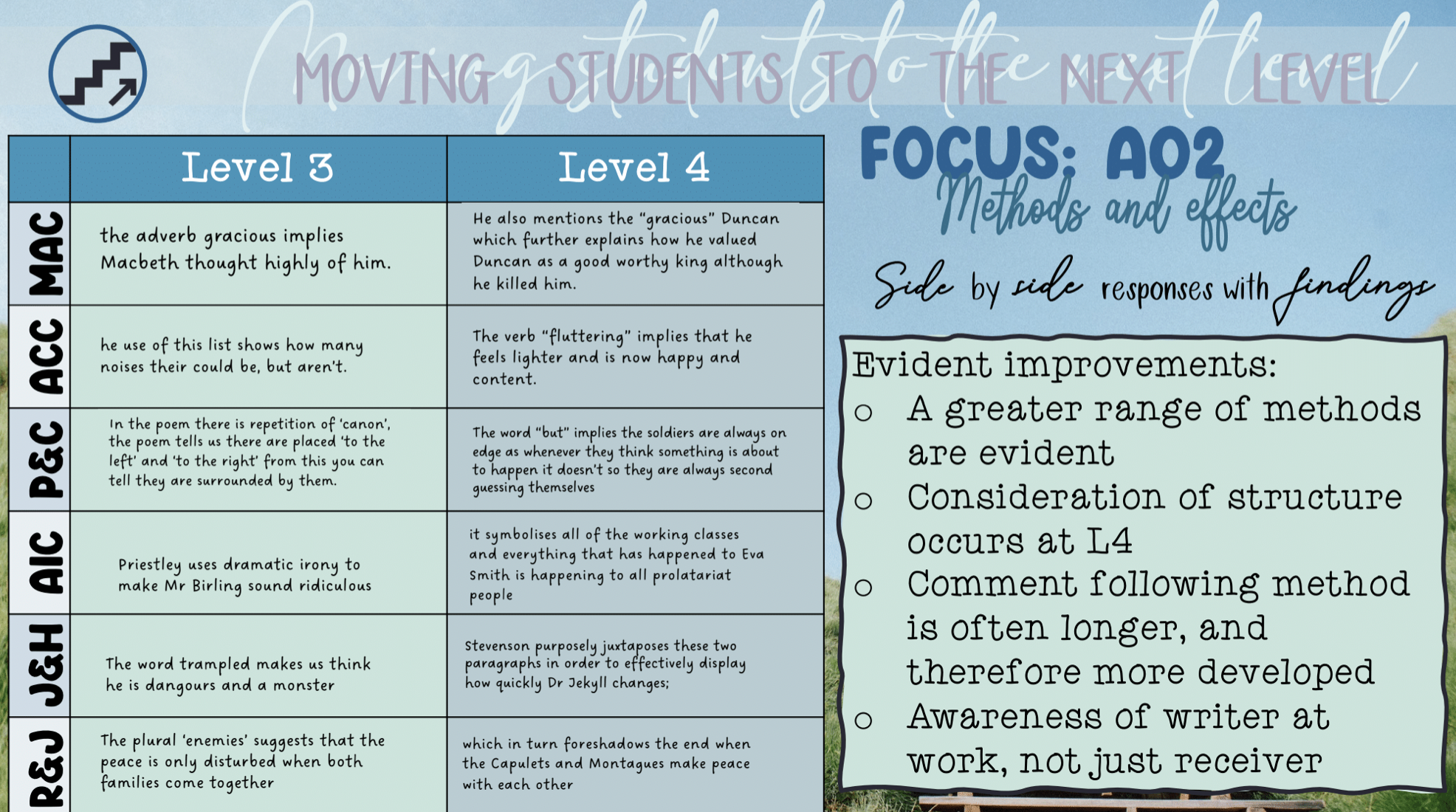 The session begins by examining and understanding level 4. We then look at examples from a range of texts – Macbeth, AIC, ACC, J&H, R&J, and both AQA poetry clusters. We then deconstruct the expectations and features of level 5, and compare examples of each of the text responses at level 5 to the level 4 examples. We then look at the findings from these comparisons and specific teaching strategies to move students up the level.